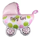 بادکنک فویلی “Baby Girl” به شکل کالسکه نوزاد، مناسب برای جشنهای Baby Shower و تولد نوزاد دختر.