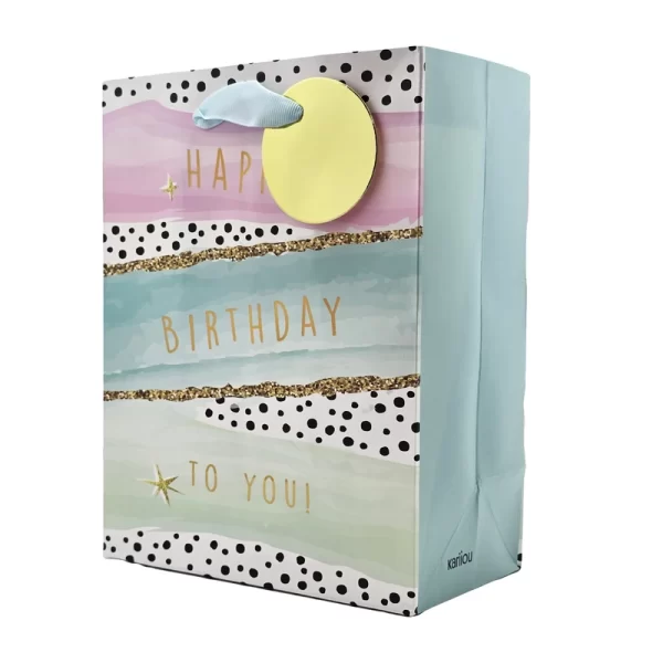 ساک دستی تولد با طرح آبرنگی، یک انتخاب لطیف و زیبا برای بستهبندی هدایا در مناسبتهای تولد است. این ساک دارای طراحی هنری و آرامشبخش با رنگهای ملایم آبی و صورتی است که همراه با نقاط مشکی و نوارهای اکلیلی طلایی در بین لایههای آبرنگی، جلوهای شیک و منحصربهفرد ایجاد کرده است. نوشتهی طلایی “Happy Birthday to You” در مرکز ساک به شکلی جذاب و برجسته به نمایش درآمده و دستهی آبی رنگ با دایرهی طلایی نیز ظاهری خاص و زیبا به این ساک بخشیده است. این ساک دستی برای افرادی که به طراحیهای ملایم و هنری علاقهمند هستند، یک گزینهی عالی برای بستهبندی هدیهی تولد محسوب میشود و هدیهی شما را با شکلی خاطرهانگیز و جذاب به مخاطب ارائه میکند.