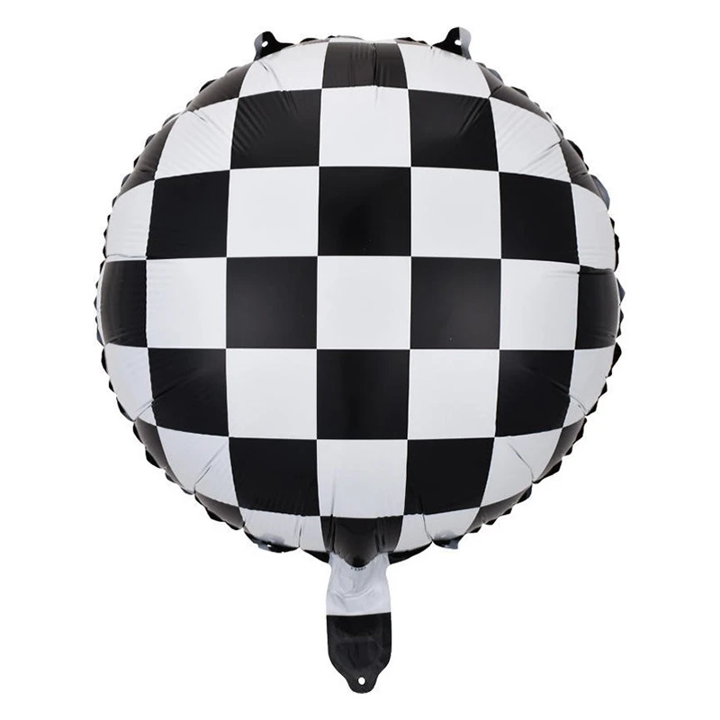 بادکنک فویلی گرد طرح شطرنج با الگوی کلاسیک سیاه و سفید، مناسب برای تزئین جشنها و مراسمهایی با تم شطرنج، مسابقات یا مهمانیهای رسمی.