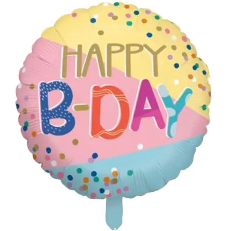 بادکنک فویلی طرح “Happy B-Day” با رنگ‌های پاستلی و نقش کنفِتی، مناسب برای تزیین جشن‌های تولد شاد و پرانرژی.