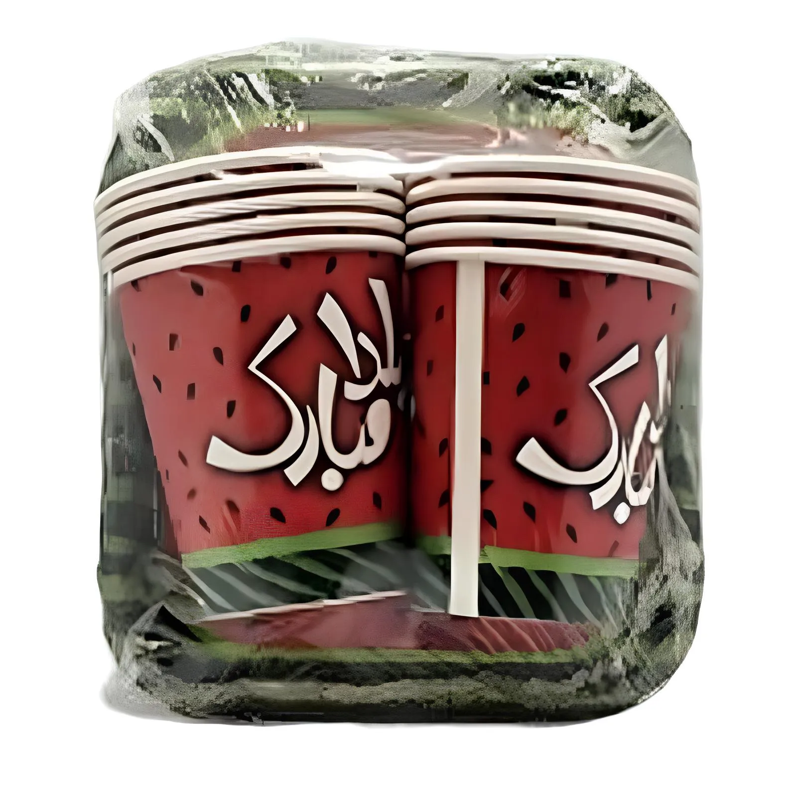 ست بشقاب و لیوان یکبار مصرف طرح یلدا با طراحی هندوانه و نوشته “یلدا مبارک”، مناسب برای جشنها و دورهمیهای شب یلدا.