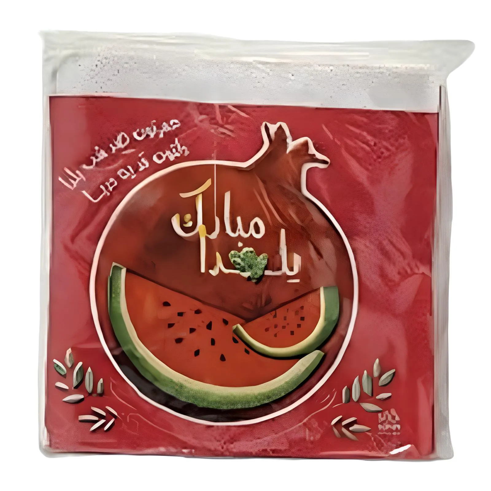 دستمال کاغذی طرح یلدا با طراحی انار و هندوانه، مناسب برای تزئین و استفاده در جشنهای شب یلدا.