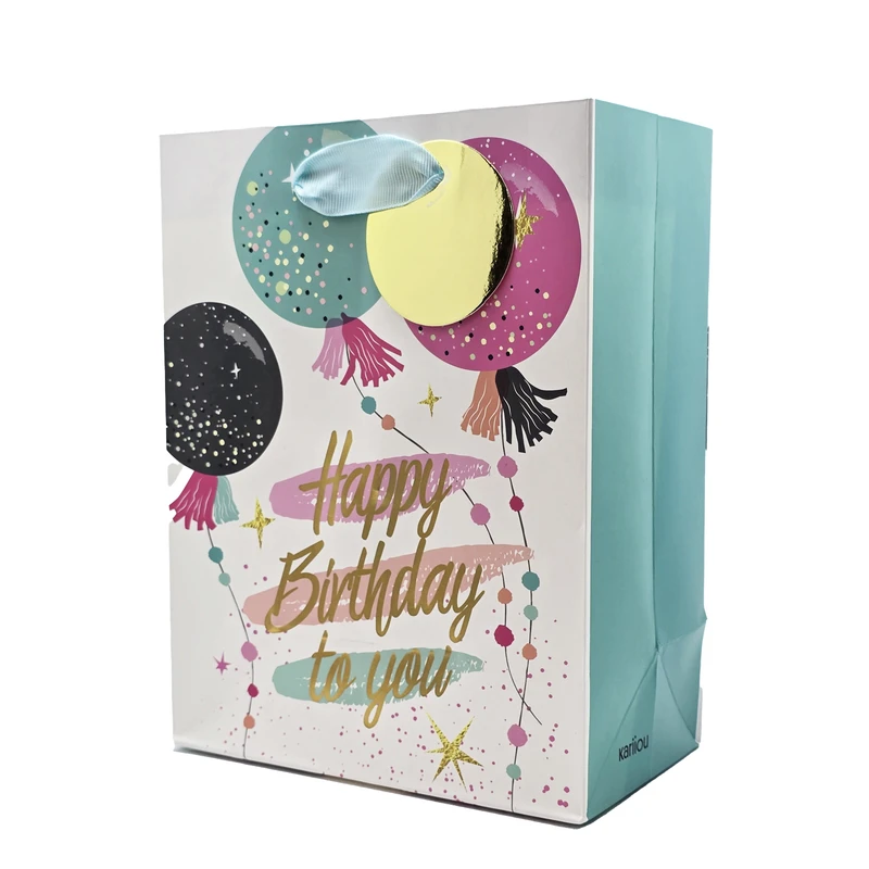 ساک دستی تولد با طراحی بادکنکی و نوشتهی “Happy Birthday to You”، مناسب برای بستهبندی هدایای تولد؛ طراحی رنگارنگ با جلوههای اکلیلی و دسته آبی.