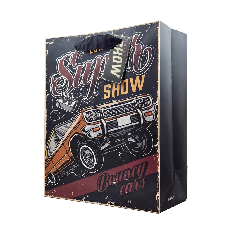 ساک دستی طرح ماشین کلاسیک مسابقهای، یک انتخاب شیک و متفاوت برای بستهبندی هدایای خاص است. این ساک دارای طراحی وینتیج و تصویر یک ماشین عضلانی قدیمی با چرخهای برجسته و بالا آمده است که حس و حال مسابقات خودروهای کلاسیک را به خوبی منتقل میکند. نوشتههای “Superb Show” و “Bouncy Cars” به همراه سبک گرافیکی خاص و استفاده از رنگهای تیره، این ساک را به گزینهای جذاب برای کسانی که به طراحیهای کلاسیک و خودروهای قدیمی علاقهمند هستند، تبدیل کرده است. دستهی مشکی رنگ نیز به این طراحی جلوهای خاص بخشیده و حمل آن را آسان کرده است. این ساک دستی برای بستهبندی هدایا و محصولات مرتبط با ماشین، به ویژه برای علاقهمندان به مسابقات و خودروهای عضلانی، گزینهای ایدهآل است.