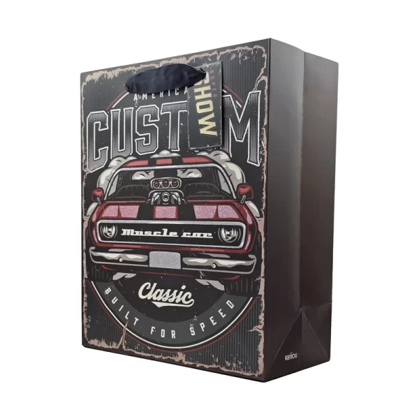 ساک دستی با طرح ماشین کلاسیک تیونینگ یک گزینه ایده‌آل برای بسته‌بندی هدایای خاص و شیک است. این ساک دارای تصویر جذابی از یک ماشین عضلانی با طراحی تیونینگ‌شده و موتور قدرتمند است که حس و حال سرعت و قدرت را به خوبی به نمایش می‌گذارد. نوشته‌های “Custom Show”، “Muscle Car” و “Built for Speed” به همراه رنگ‌های تیره و سبک گرافیکی وینتیج، این ساک را به گزینه‌ای جذاب برای کسانی که به دنیای خودروهای کلاسیک و تیونینگ علاقه دارند تبدیل کرده است. دسته‌ی مشکی این ساک نیز با طراحی کلی هماهنگی داشته و حمل آن را آسان می‌کند. این ساک دستی برای بسته‌بندی هدایا و محصولات مرتبط با ماشین، به ویژه برای دوستداران خودروهای عضلانی و تیونینگ، گزینه‌ای ایده‌آل است.