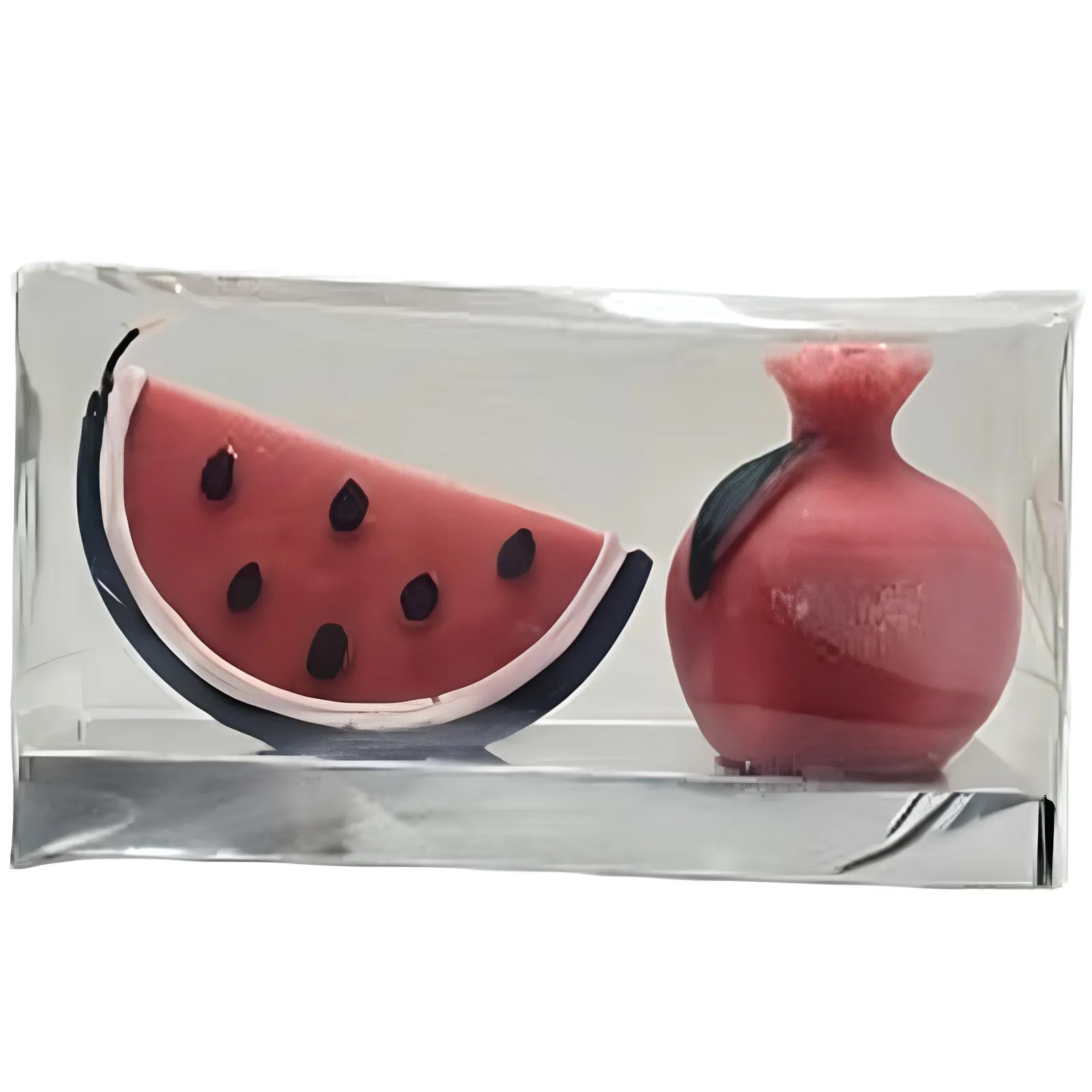 ست شمع طرح انار و هندوانه، با طراحی زیبا و جذاب، مناسب برای شب یلدا و دکوراسیون خاص.