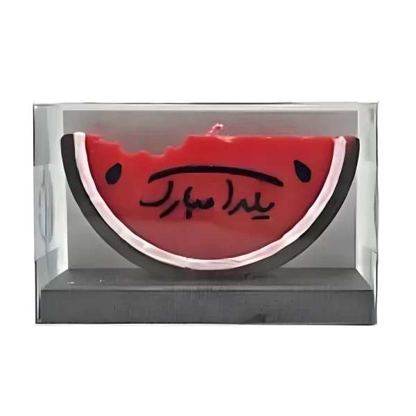 شمع طرح هندوانه با نوشته “یلدا مبارک”، مناسب برای تزئین شب یلدا و ایجاد فضایی دلنشین.