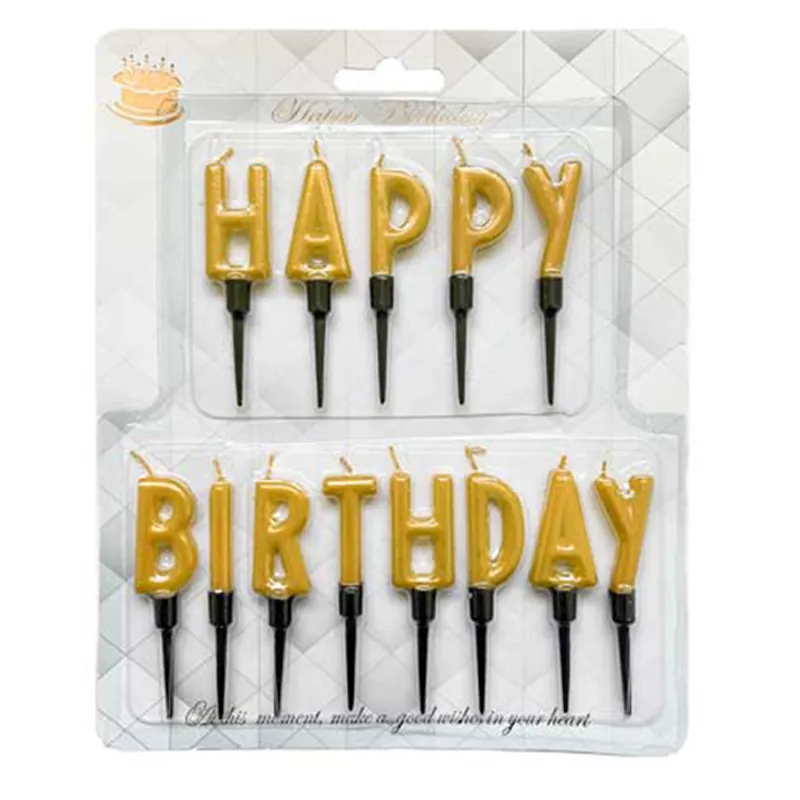 شمع تولد طلایی “HAPPY BIRTHDAY” با طراحی شیک و جذاب، مناسب برای تزئین کیک و ایجاد جلوهای خاص در جشن تولد.