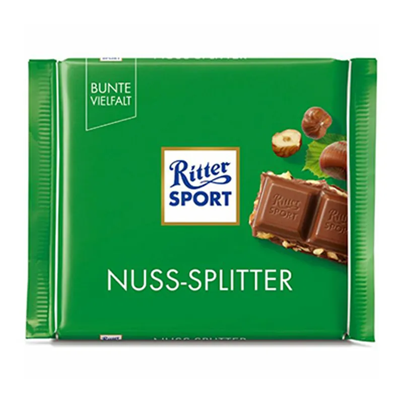“شکلات ریتر اسپرت Nuss-Splitter، ترکیبی خوشمزه از شکلات شیری و تکههای فندق خرد شده.”