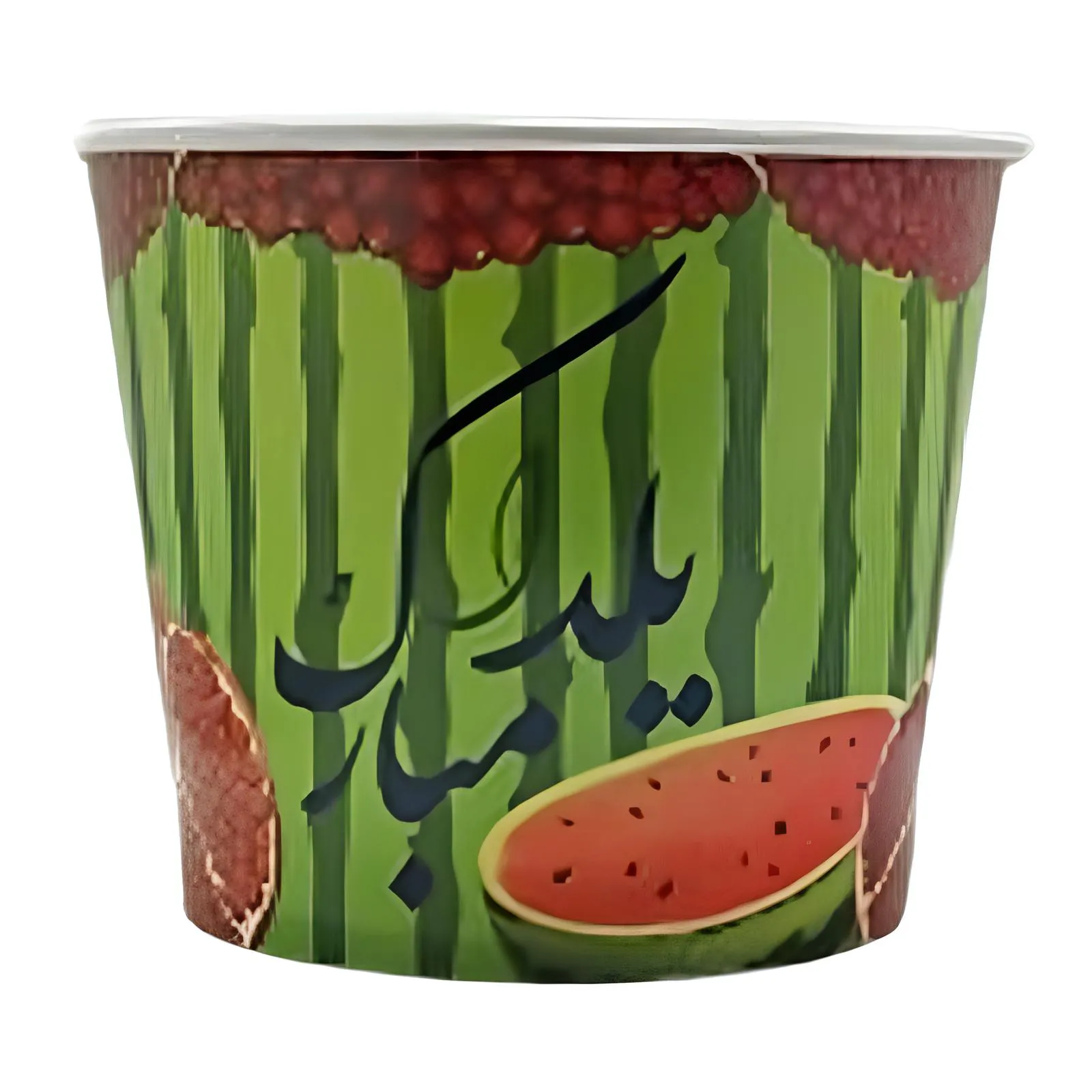 ظرف پاپکورن طرح یلدایی با طراحی هندوانه و نوشته “یلدا مبارک”، مناسب برای پذیرایی در شب یلدا.