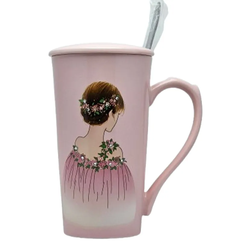 ماگ سرامیکی طرح دخترانه گلدار، با درب و قاشق استیل، مناسب برای هدیه و استفاده روزمره.