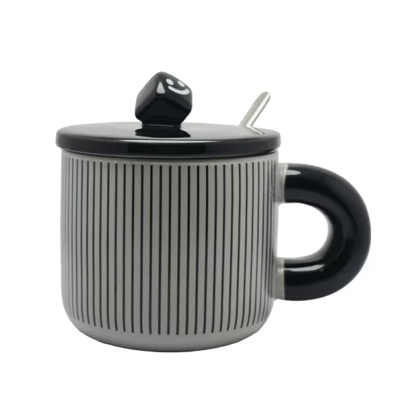 خرید ماگ دستهدار با طرح تاس و راهراههای عمودی، همراه با درب و قاشق. مناسب برای استفاده روزانه و هدیه با طراحی مدرن و مینیمال.