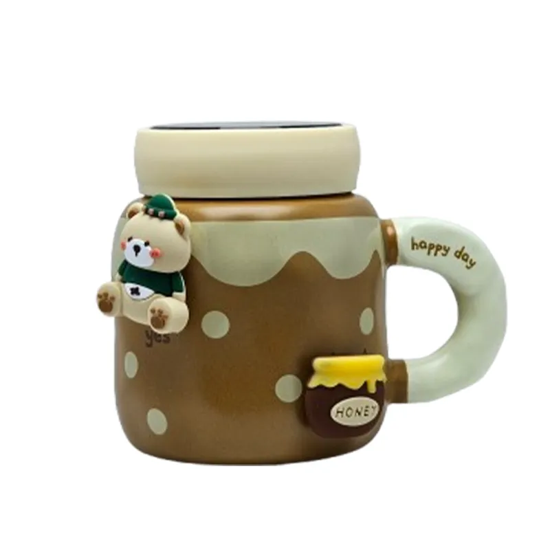 ماگ سرامیکی قهوهای طرح خرس و عسل با قاشق مخصوص، مناسب برای هدیه و استفاده روزانه.