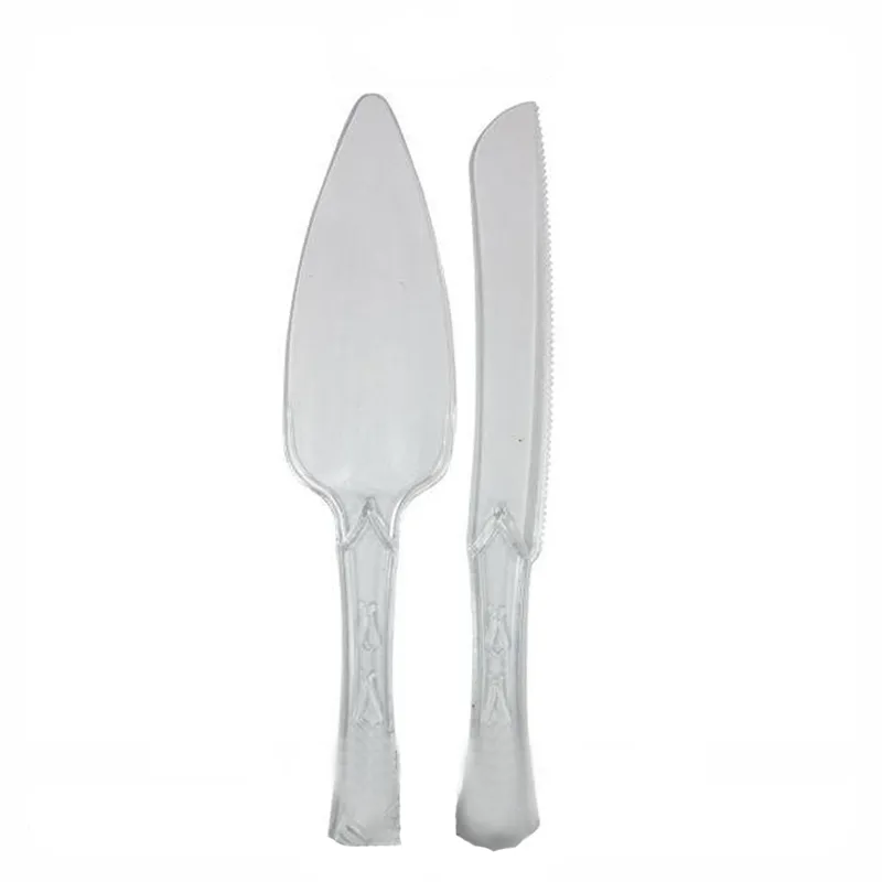 “ست چاقو و کفگیر شفاف از جنس پلاستیک مقاوم، مناسب برای برش و سرو کیک در جشنهای مختلف.”