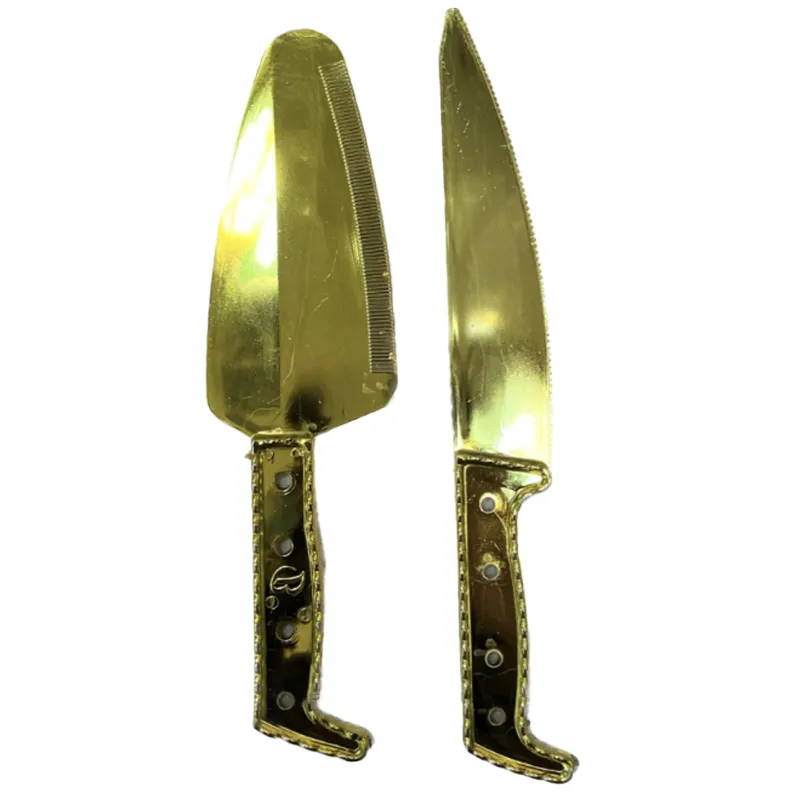 “ست چاقو و کفگیر مخصوص برش کیک، با طراحی لاکچری و رنگ طلایی براق، مناسب برای جشنهای عروسی، تولد، سالگرد ازدواج و مهمانیهای خاص. این ست جلوهای شیک به لحظهی برش کیک میبخشد و برای عکاسی از لحظات خاص ایدهآل است.”
